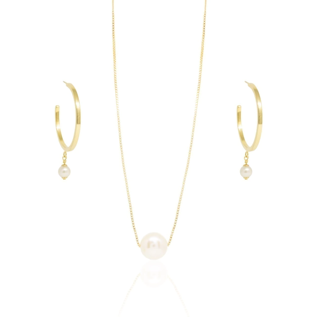 Combo brinco de argola com pérola + colar de pérola no banho de ouro.